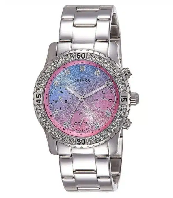 Montre pour Femme de la Marque : Guess – Référence : W0774L1 – Fonctionnalités : Chronographe – Mouvement : Quartz – Matière du boîtier : Acier inoxydable – Diamètre du boîtier : 36 mm – Matière du bracelet : Acier inoxydable – Largeur du bracelet : 18 mm – Type de verre : Minéral – Garantie : 2 ans