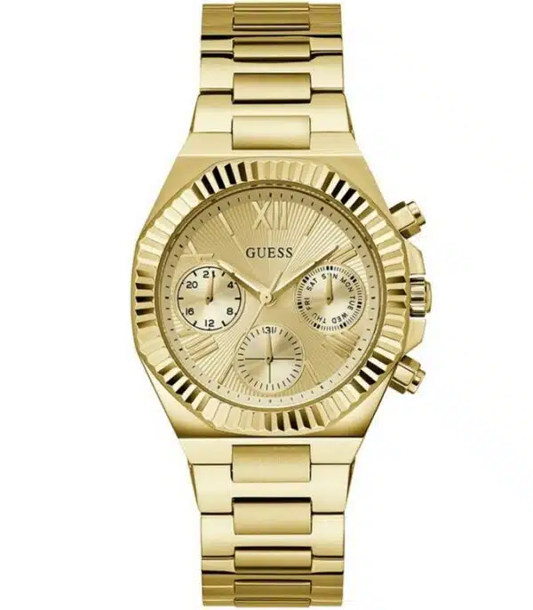 Montre pour Femme de la Marque : Guess – Référence : GW0769L2 – Fonctionnalités : Chronographe – Mouvement : Quartz – Matière du boîtier : Acier inoxydable – Diamètre du boîtier : 38 mm – Matière du bracelet : Acier inoxydable – Largeur du bracelet : 22 mm – Type de verre : Minéral – Garantie : 2