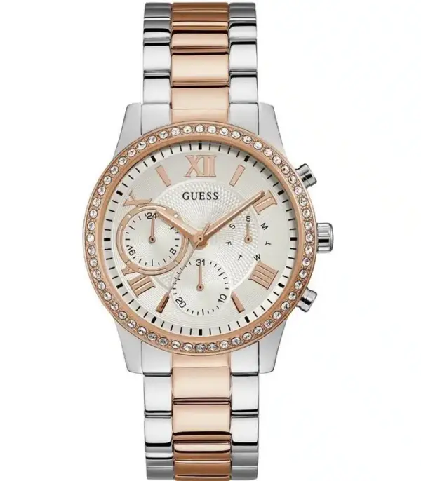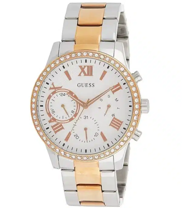 Montre pour Femme de la Marque : Guess – Référence : W1069L4 – Fonctionnalités : Chronographe – Mouvement : Quartz – Matière du boîtier : Acier inoxydable – Diamètre du boîtier : 40 mm – Matière du bracelet : Acier inoxydable – Largeur du bracelet : 20 mm – Type de verre : Minéral – Garantie : 2