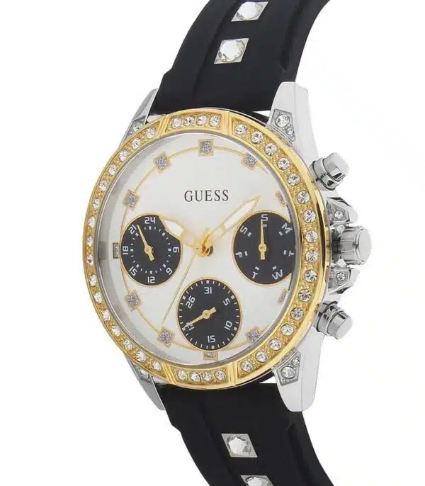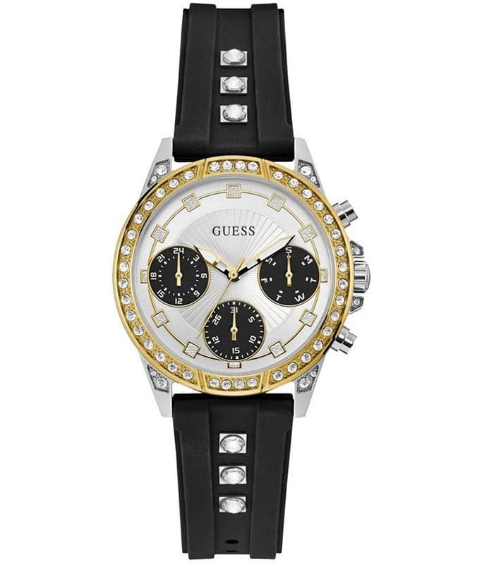 Montre pour Femme de la Marque : Guess – Référence : W1292L1 – Fonctionnalités : Chronographe – Mouvement : Quartz – Matière du boîtier : Acier inoxydable – Diamètre du boîtier : 36 mm – Matière du bracelet : Silicone – Largeur du bracelet : 18 mm – Type de verre : Minéral – Garantie : 2 ans Livré
