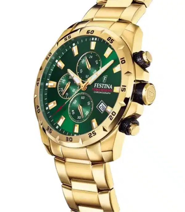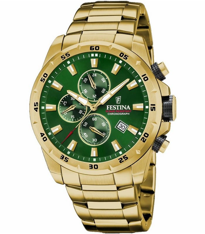 Montre pour Homme de la Marque : Festina – Référence : F20541 Fond Vert – Fonctionnalités : Chronographe – Mouvement : Quartz – Matière du boîtier : Acier inoxydable – Diamètre du boîtier : 45 mm – Matière du bracelet : Acier inoxydable  – Largeur du bracelet : 23 mm – Type de verre : Minéral – Garantie