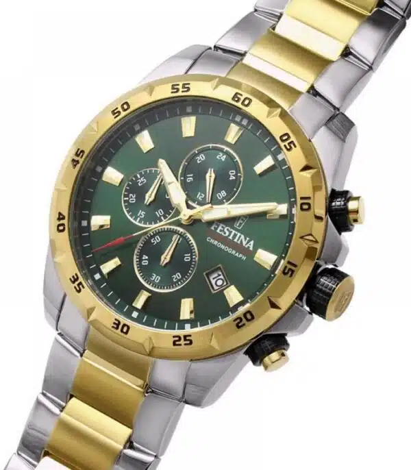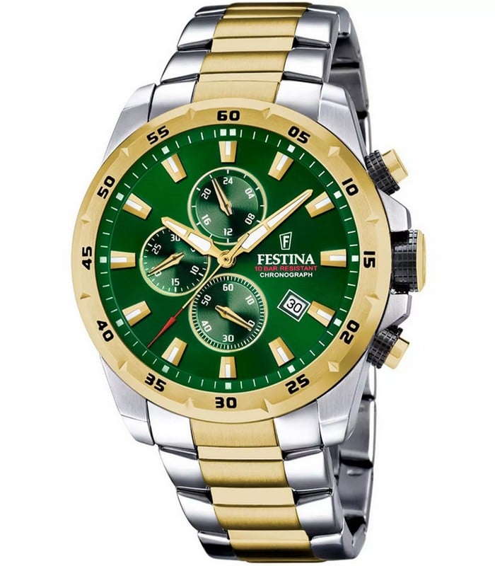 Montre pour Homme de la Marque : Festina – Référence : F20562 Fond Vert – Fonctionnalités : Chronographe – Mouvement : Quartz – Matière du boîtier : Acier inoxydable – Diamètre du boîtier : 45 mm – Matière du bracelet : Acier inoxydable  – Largeur du bracelet : 23 mm – Type de verre : Minéral – Garantie