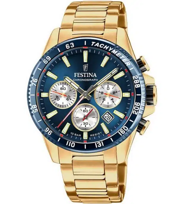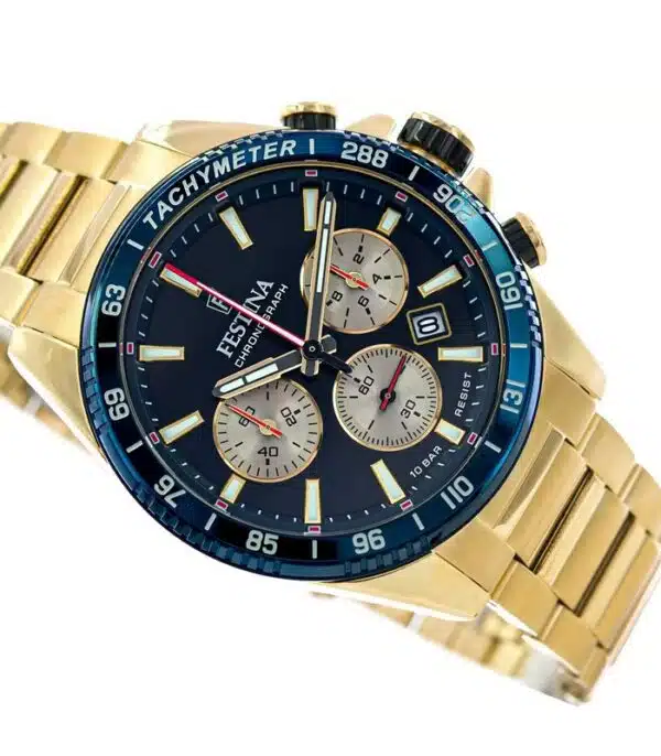 Montre pour Homme de la Marque : Festina – Référence : F20634 Doré Fond Bleu – Fonctionnalités : Chronographe – Mouvement : Quartz – Matière du boîtier : Acier inoxydable – Diamètre du boîtier : 45 mm – Matière du bracelet : Acier inoxydable – Largeur du bracelet : 22 mm – Type de verre : Minéral –