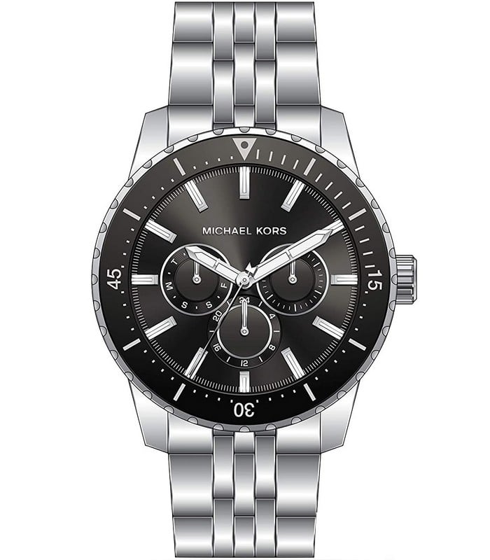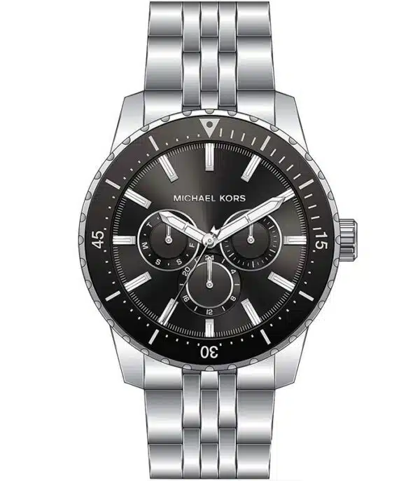 Montre pour Homme de la Marque : Michael Kors – Référence : MK7156 – Fonctionnalités : Chronographe – Mouvement : Quartz – Matière du boîtier : Acier inoxydable – Diamètre du boîtier : 44 mm – Matière du bracelet : Acier inoxydable – Largeur du bracelet : 22 mm – Type de verre : Minéral – Garantie
